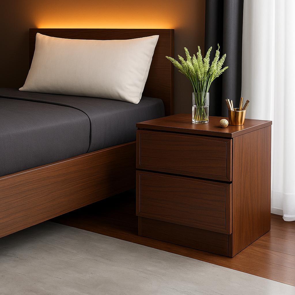 Elevate your space with the Mahogany Velvet Side Table, a timeless piece crafted from 18mm plywood and finished in a rich, matt mahogany tone. Its dual drawers offer practical storage with a touch of velvet luxury, blending elegance and simplicity for bedroom, study, or office. Perfect for those who appreciate multipurpose design and understated sophistication.