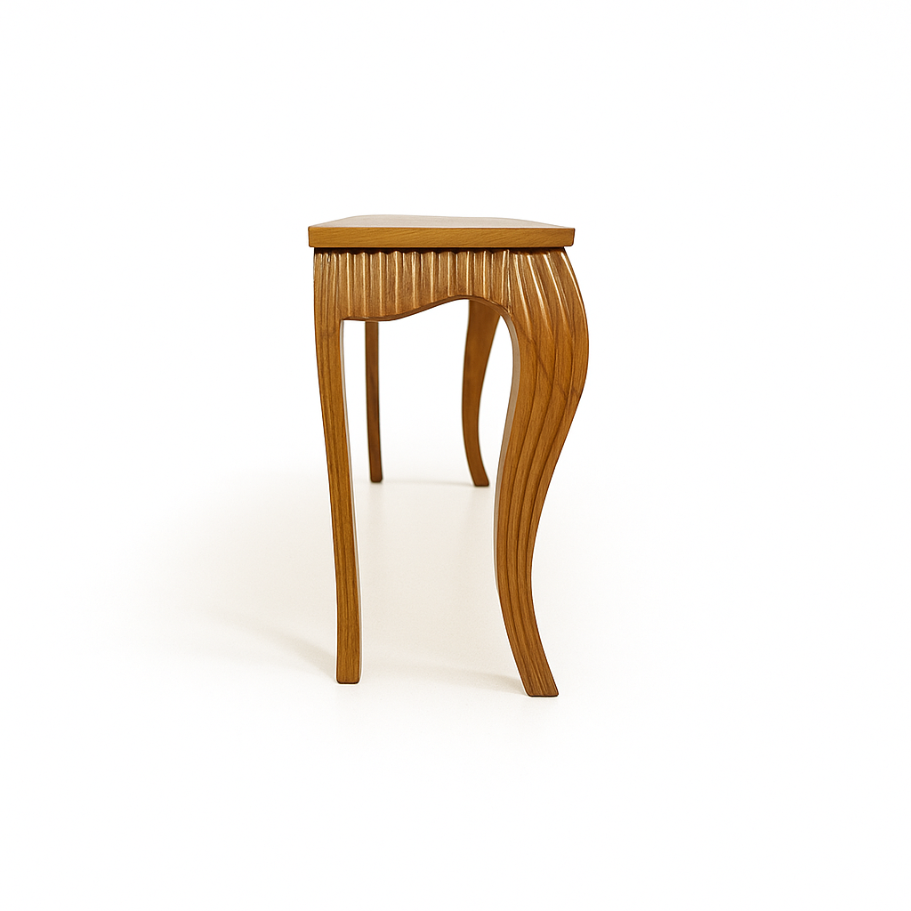 Grace and craftsmanship come together in the Serafina Curved Teak Console, a masterpiece that redefines timeless luxury. Crafted from a Sawan timber frame with a CP teak wood base, this console table exudes warmth, strength, and sophistication. The sculpted curves of its legs and delicately fluted apron reflect meticulous hand-finishing, while the matte polish enhances its natural teak grain with a soft, velvety glow. Perfect for hallways, living rooms, or foyers, the Serafina Console adds a refined statement to any interior effortlessly balancing artistry with utility. Its elegant silhouette makes it ideal for displaying sculptures, lamps, or curated décor, making every space feel curated, calm, and captivating.