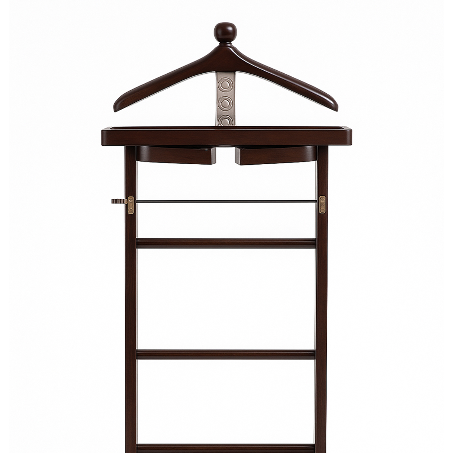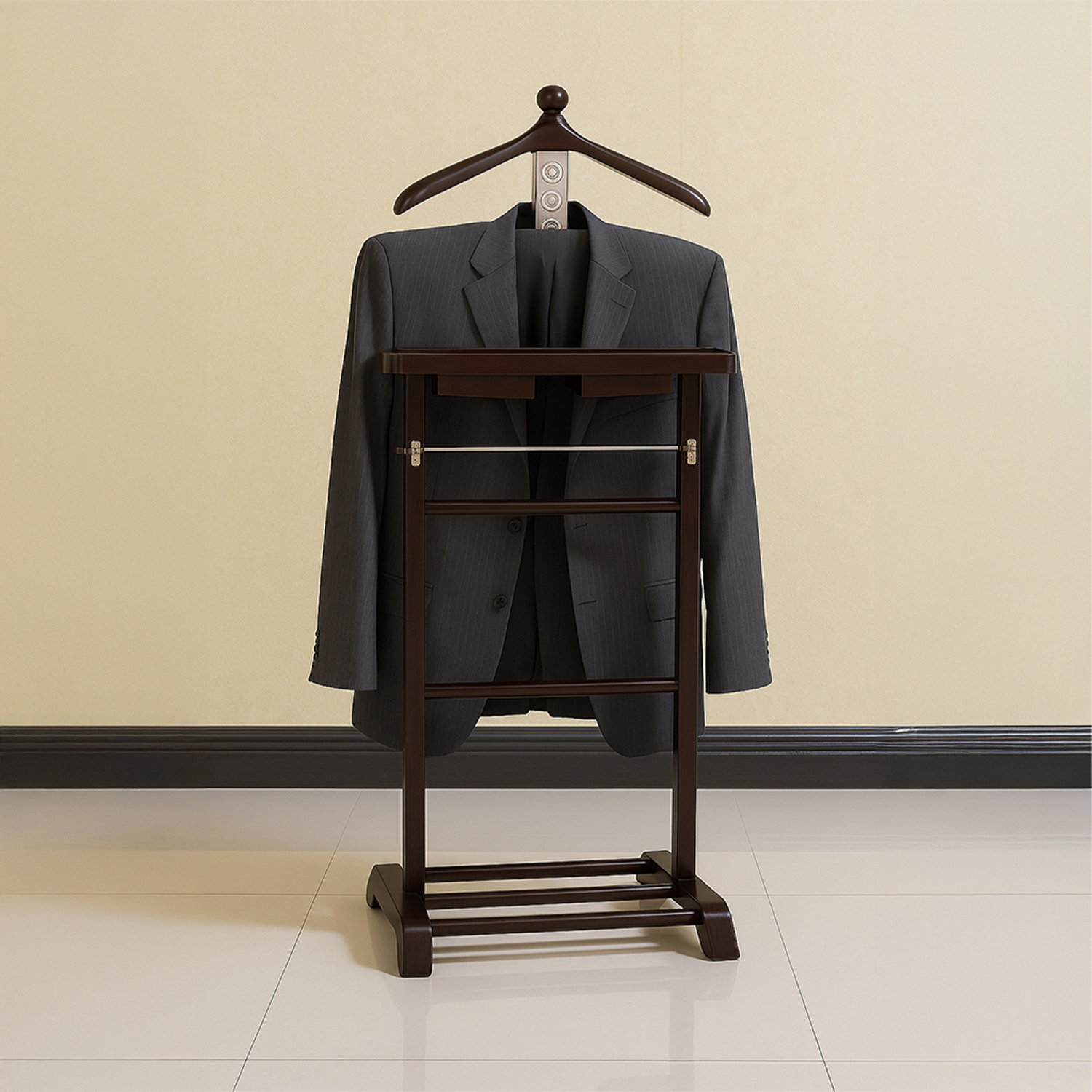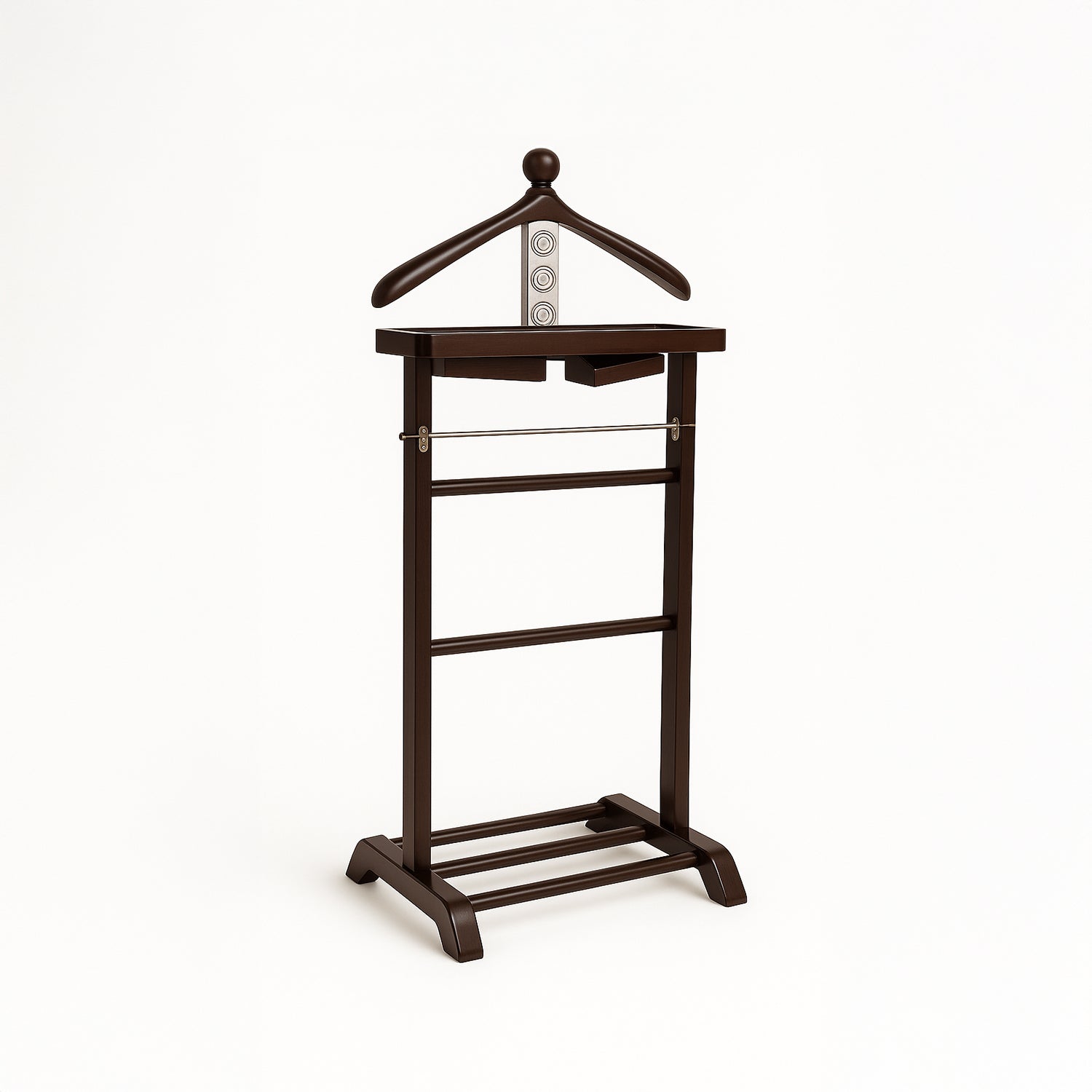 Crafted from CP teak wood and finished in a rich dark walnut polish, The Heritage Valet Stand adds vintage flair to your daily routine. A nod to old-world charm, this antique-inspired piece is perfect for organizing coats, trousers, or accessories in style. Ideal for bedrooms, foyers, or refined office corners.