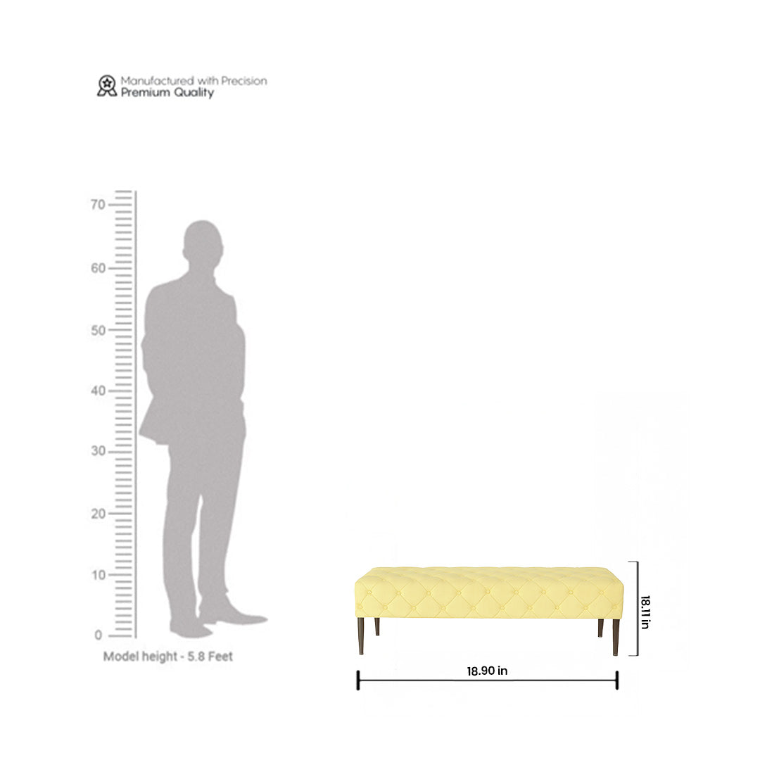 Brighten your space with the Soleil Ottoman — a sun-kissed, velvet-tufted bench crafted with CP teak and finished legs in dark walnut. Designed for versatility, it serves as a stylish shoe rack companion, bedroom dewan, or study bench. Functional elegance, made for everyday living and timeless charm.