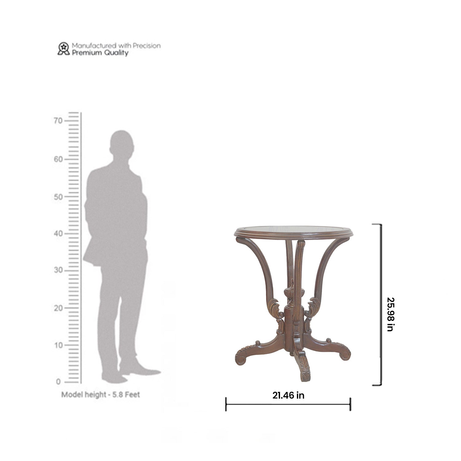 Introduce timeless charm to your interiors with the Victorian Elegance Carved Glass Top Table. Meticulously crafted from premium CP Teakwood, this table exudes classical sophistication with its hand-carved base, ornate scrollwork, and finely turned legs. The round tabletop is adorned with a frosted floral glass inlay, offering a refined contrast to the rich wooden frame.