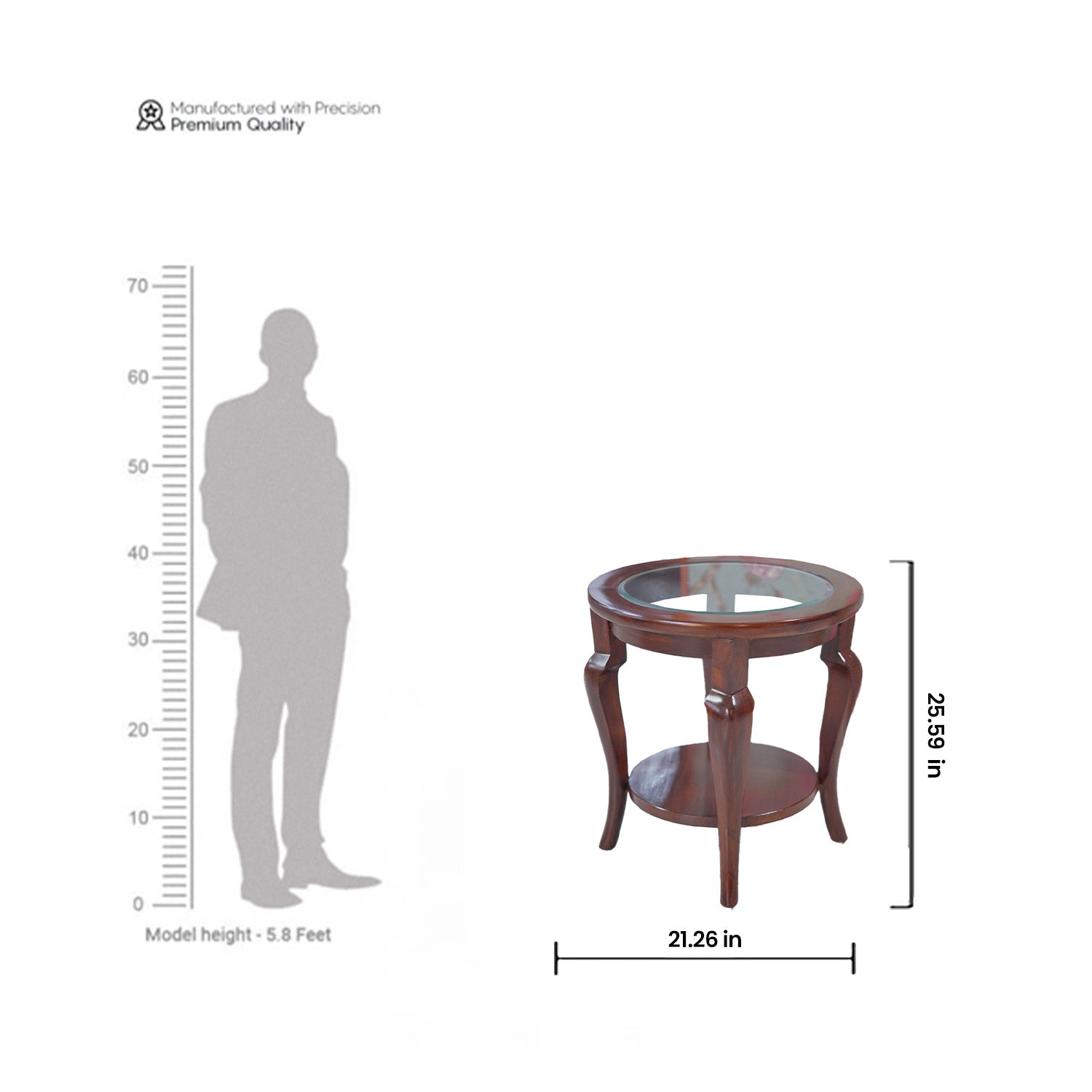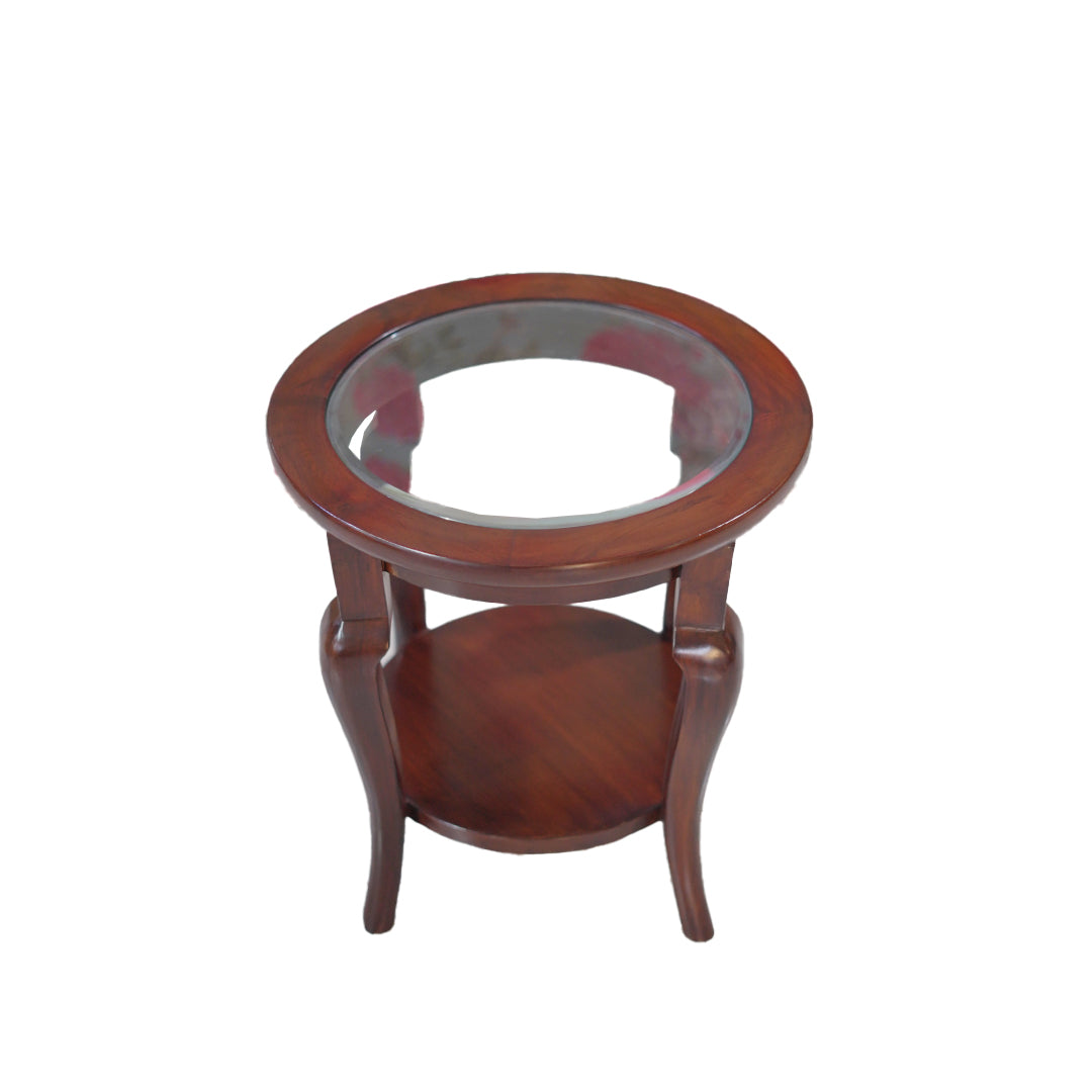 Add a timeless charm to your interior with the Vintage Round Glass-Top End Table. Crafted from durable CP teakwood, this piece features gracefully curved legs and a lower wooden shelf for additional utility. The circular glass inset top adds a refined touch, offering an elegant view into the craftsmanship beneath. Finished in a dark walnut tone with a smooth matt polish, this table complements both classic and transitional decor. Whether placed beside a sofa or used as a standalone accent, it brings warmth and sophistication to any space.